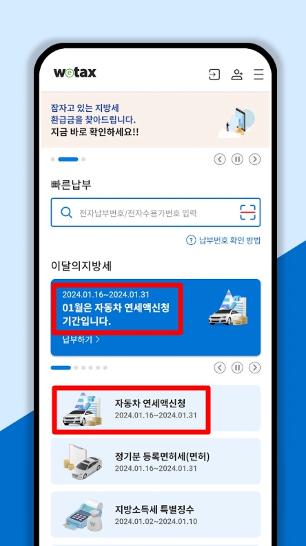 위택스나 이택스를 통해 자동차세 연납을 신청할 수 있습니다.